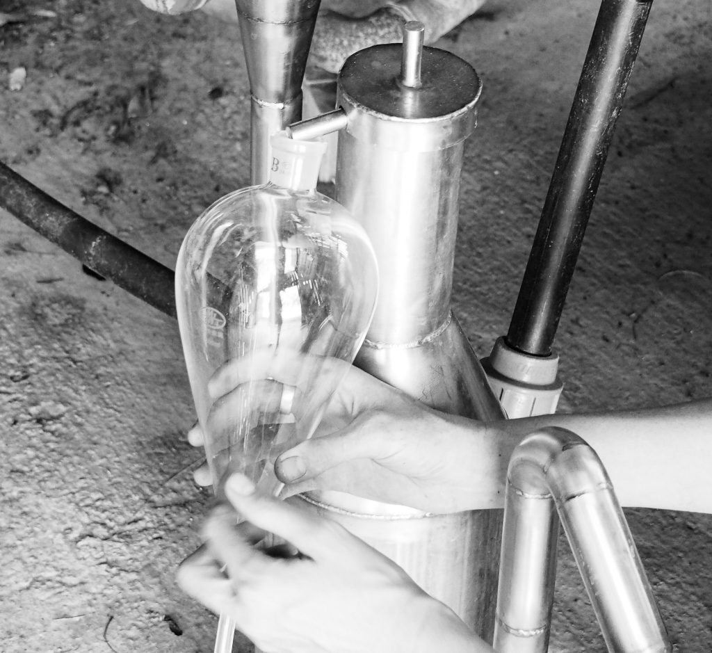 Le distillat se forme, c’est un mélange d’huile essentielle et d’eau florale. Comme l’huile essentielle est plus légère que l’eau florale, la séparation se fait ensuite dans « l’essencier ». Les eaux florales sortent en continu par le tuyau du bas et on récupère l’huile essentielle par le tuyau du haut.