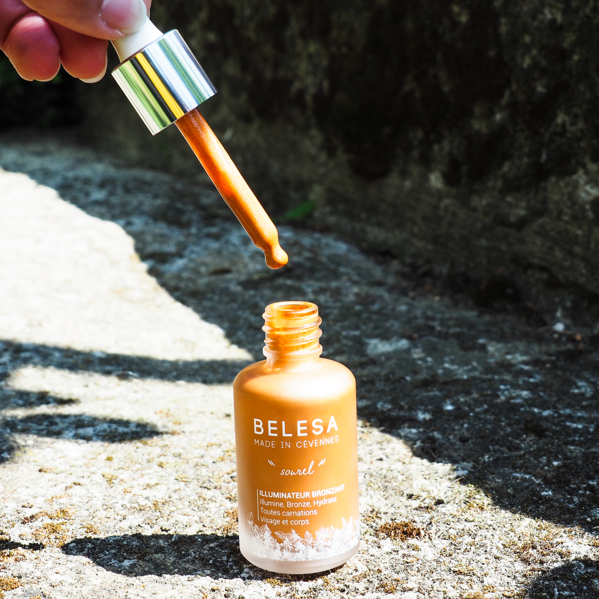 Pour un effet léger, mélanger une à deux gouttes à votre soin ou appliquer directement sur le visage.